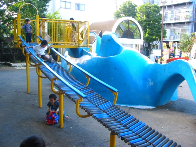 公園のメインは青い大きな石の滑り台。その他には小さな滑り台、ブランコ、砂場など遊具はどれも小さめなので、小さい子向けの公園ですね。この日は大きな子がたくさんいましたけど・・。